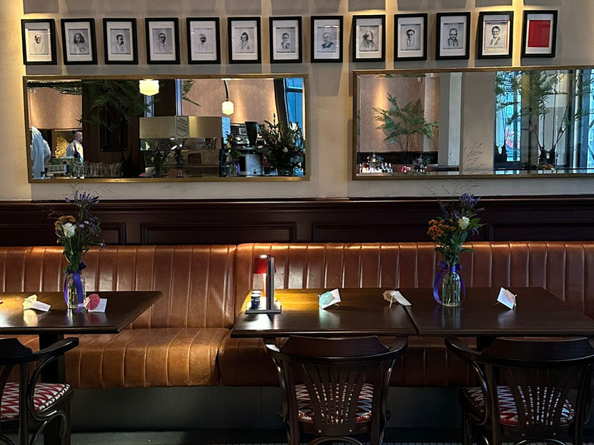 Een eeuwenoud pand met veel historie verbouwen is altijd een uitdaging. Het nieuwe concept moest een warme uitstraling krijgen die voelt alsof het altijd al zo geweest is maar dan met een modern jasje. Een rustige basis met oude sferen maar met de stoffen kan je altijd wat extra spanning creëeren. De tafels aan de bar maken het helemaal af.